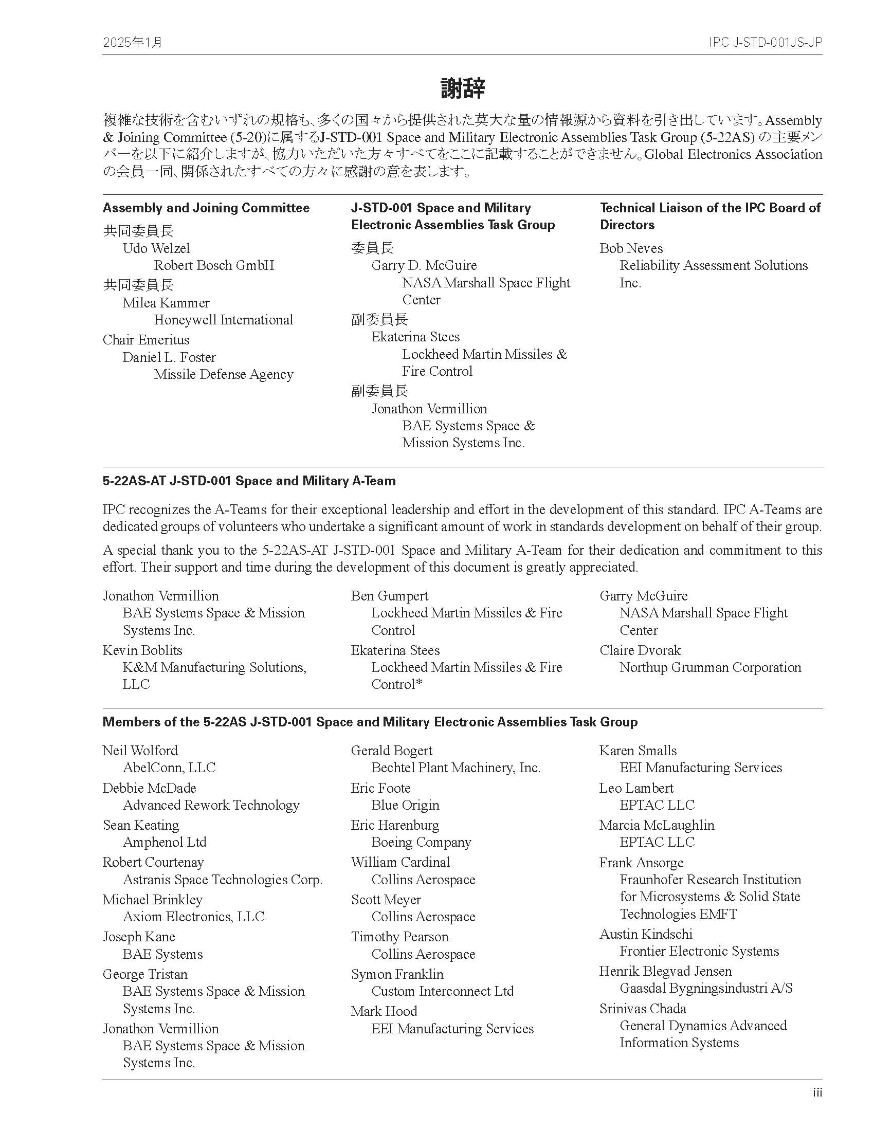 『はんだ付される電気および電子組立品に関する要求事項:宇宙・軍事用途向け追加規格』IPC J-STD-001JS 宇宙用追加規格は、宇宙・軍事用途において振動や熱サイクル環境に耐え、動作することが求められる電気・電子組立品に関し、J-STD-001Jの特定要求事項を補完する、もしくは置き換えるものである。