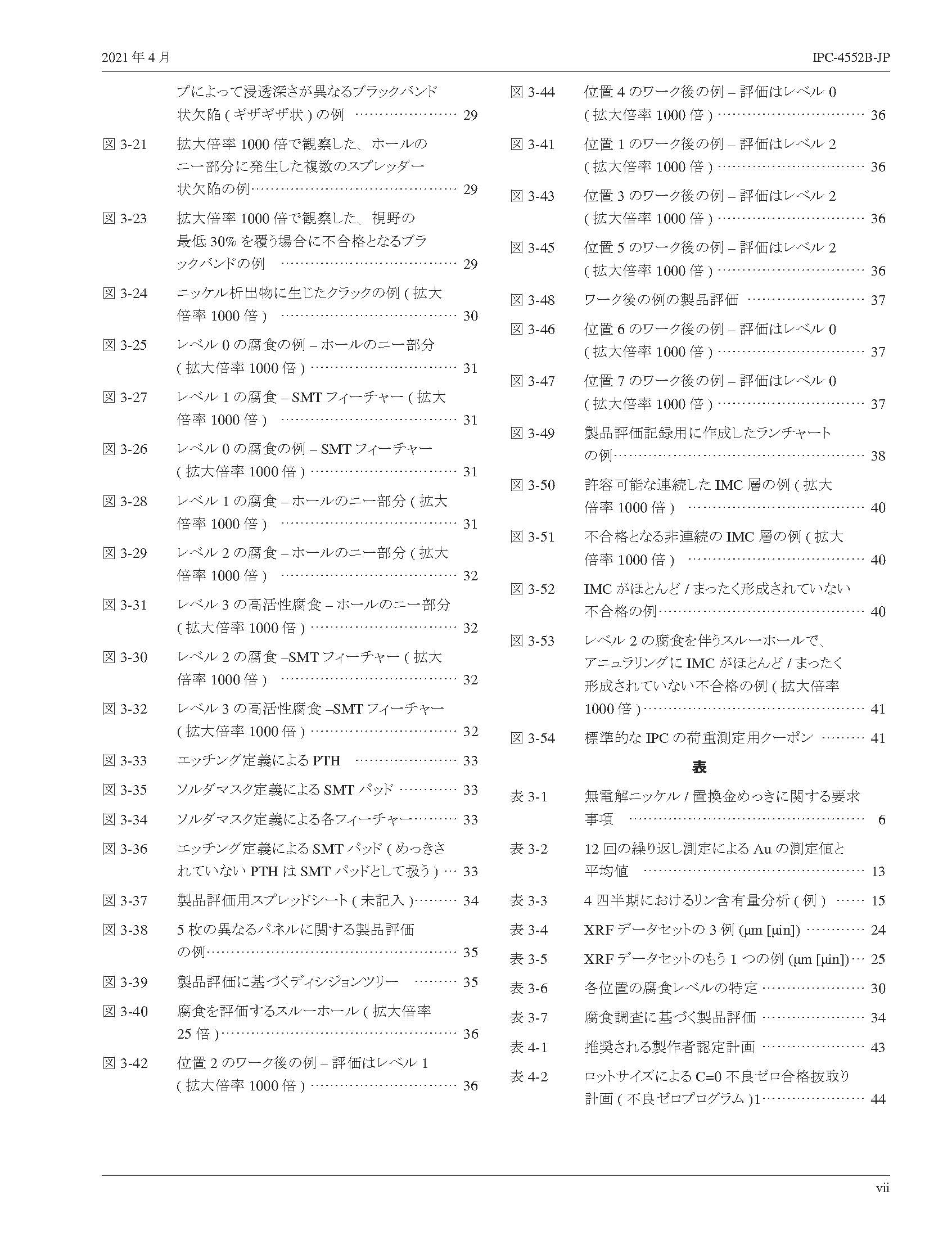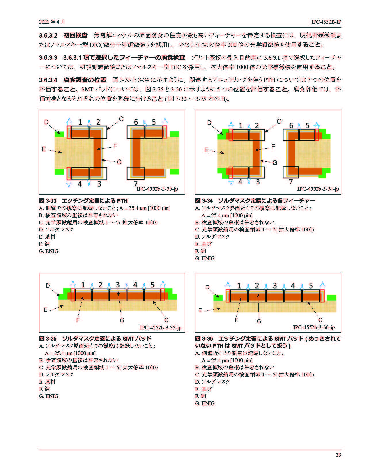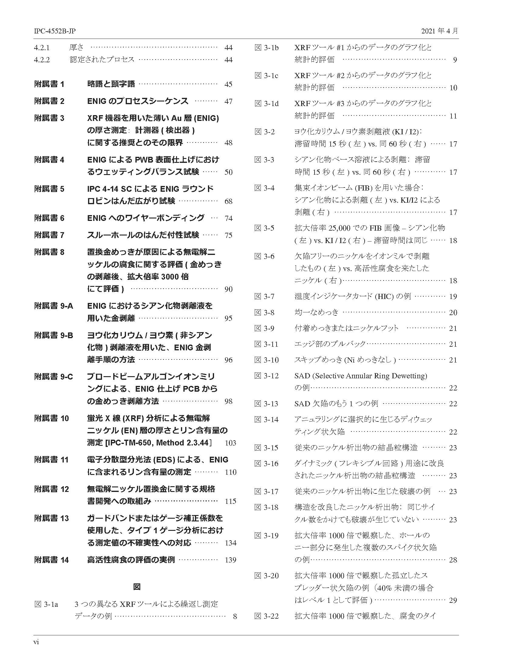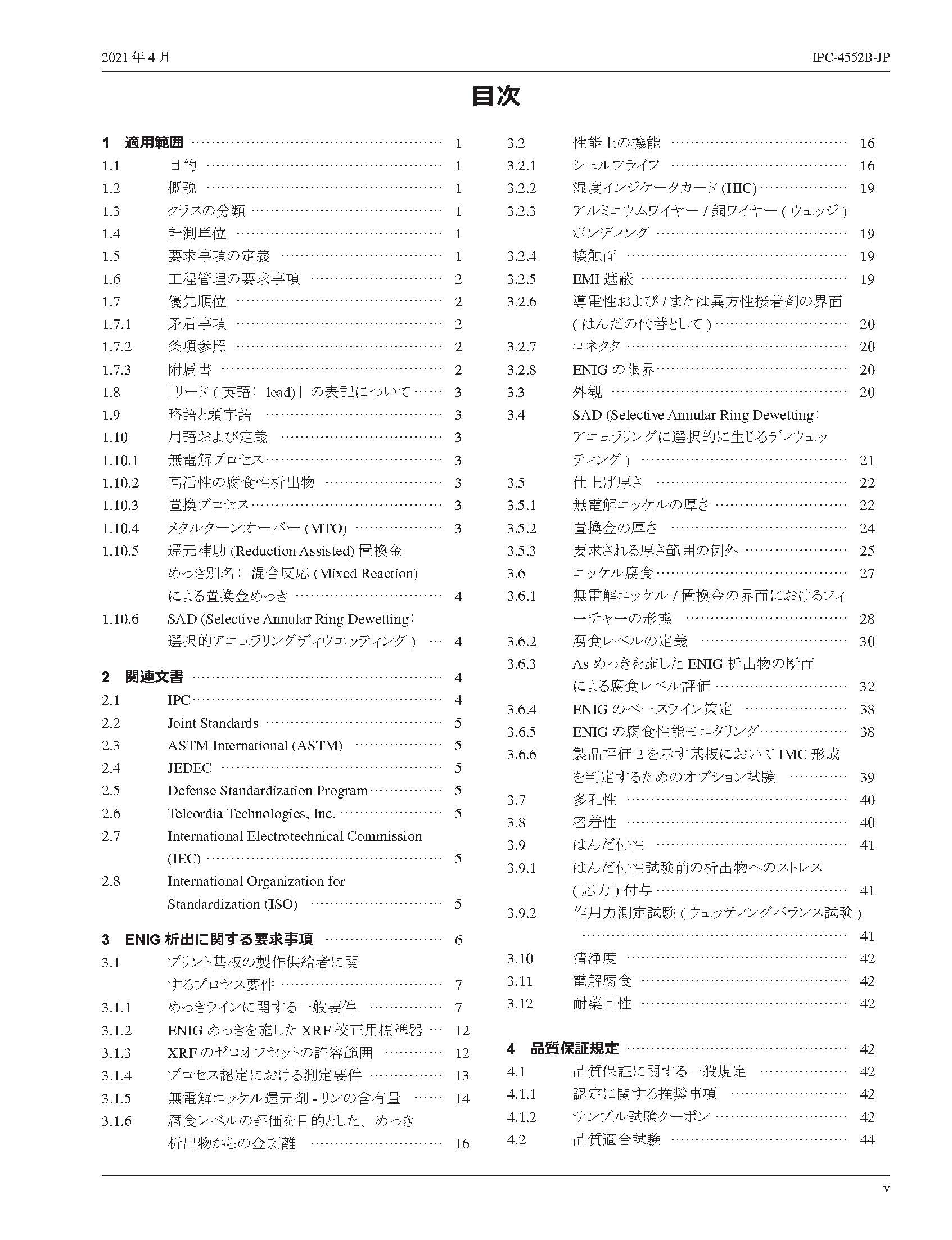 『プリント基板用無電解ニッケル/置換金(ENIG)めっきの性能仕様』IPC-4552Bは、はんだ付、ワイヤーボンディングおよび接点の仕上げ等の用途における無電解ニッケル/置換金(ENIG)めっきの析出厚さに関する要件を定めるものである。 本規格書では、IPC-6010文書群(IPC-6012、IPC-6013、IPC-6018等)に記載する性能基準に適合するための、基板の受入れ/許容基準について規定する。 本書で指定するENIGの析出物は、IPC-J-STD-003のプリント基板のはんだ付性仕様に規定される最上位のコーティング耐久性等級に適合するものである。