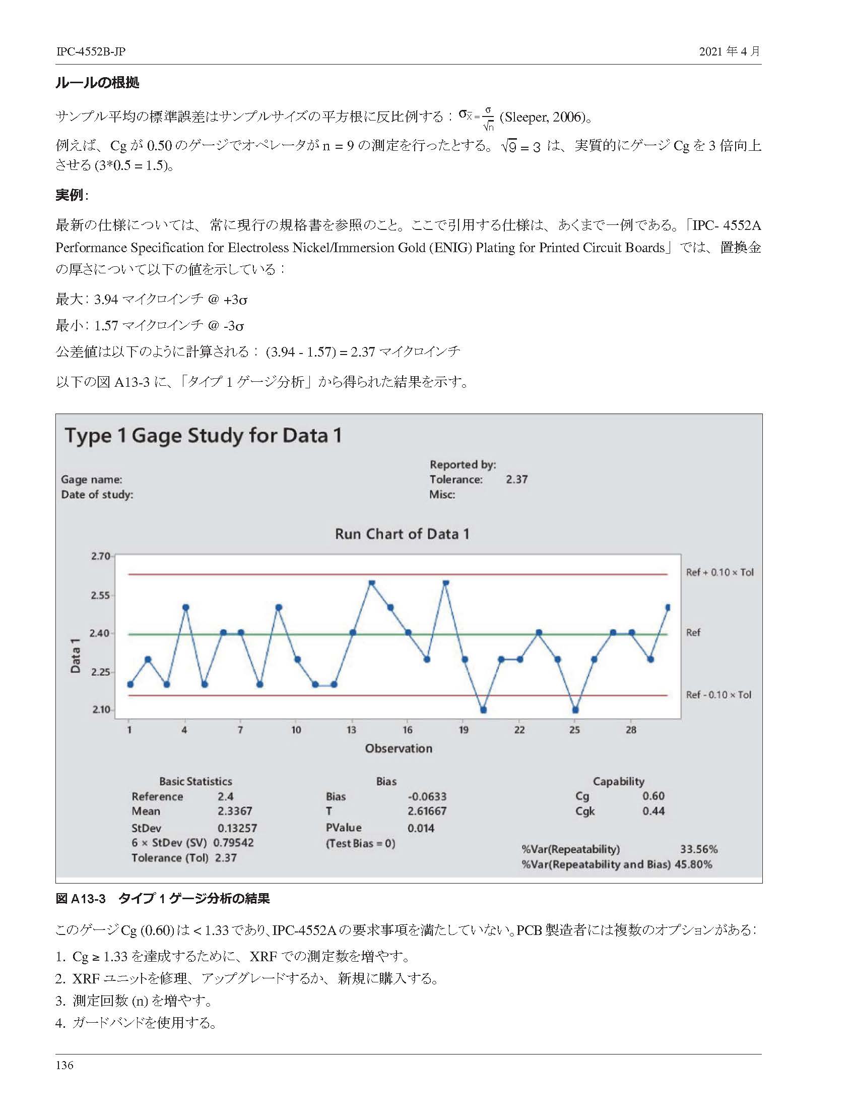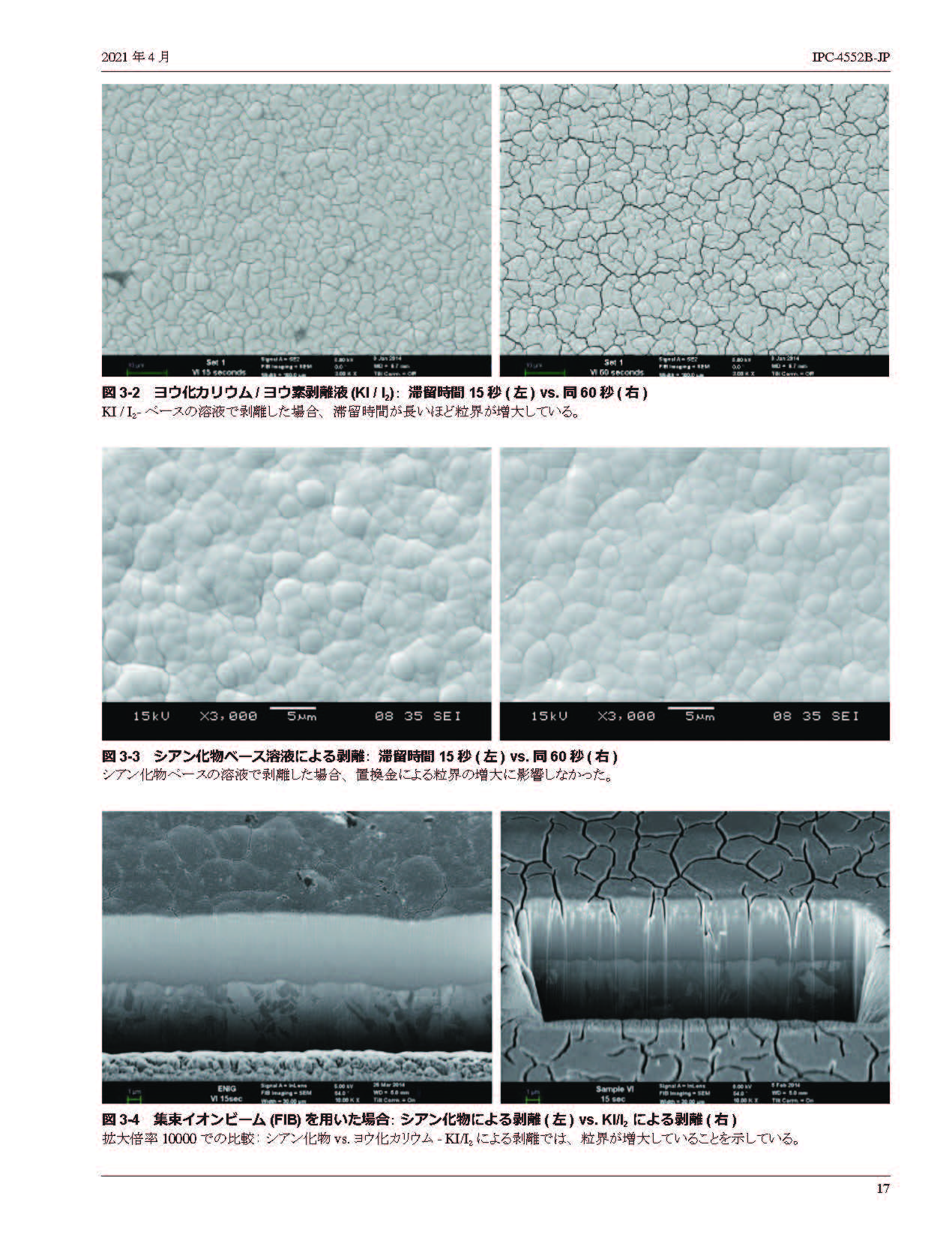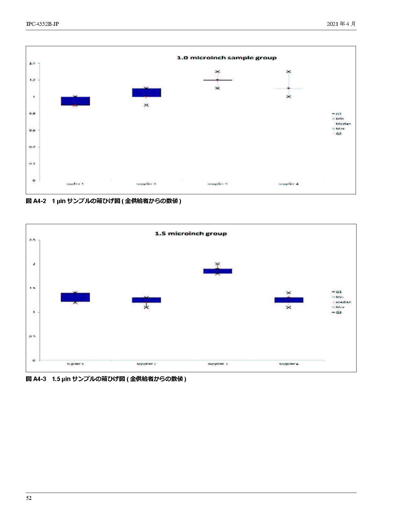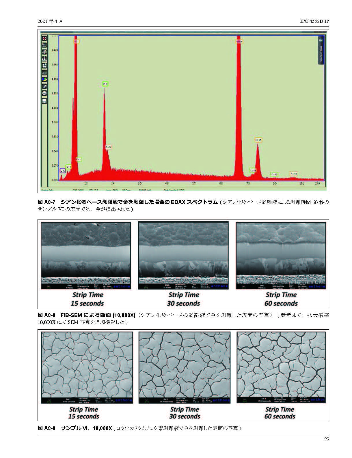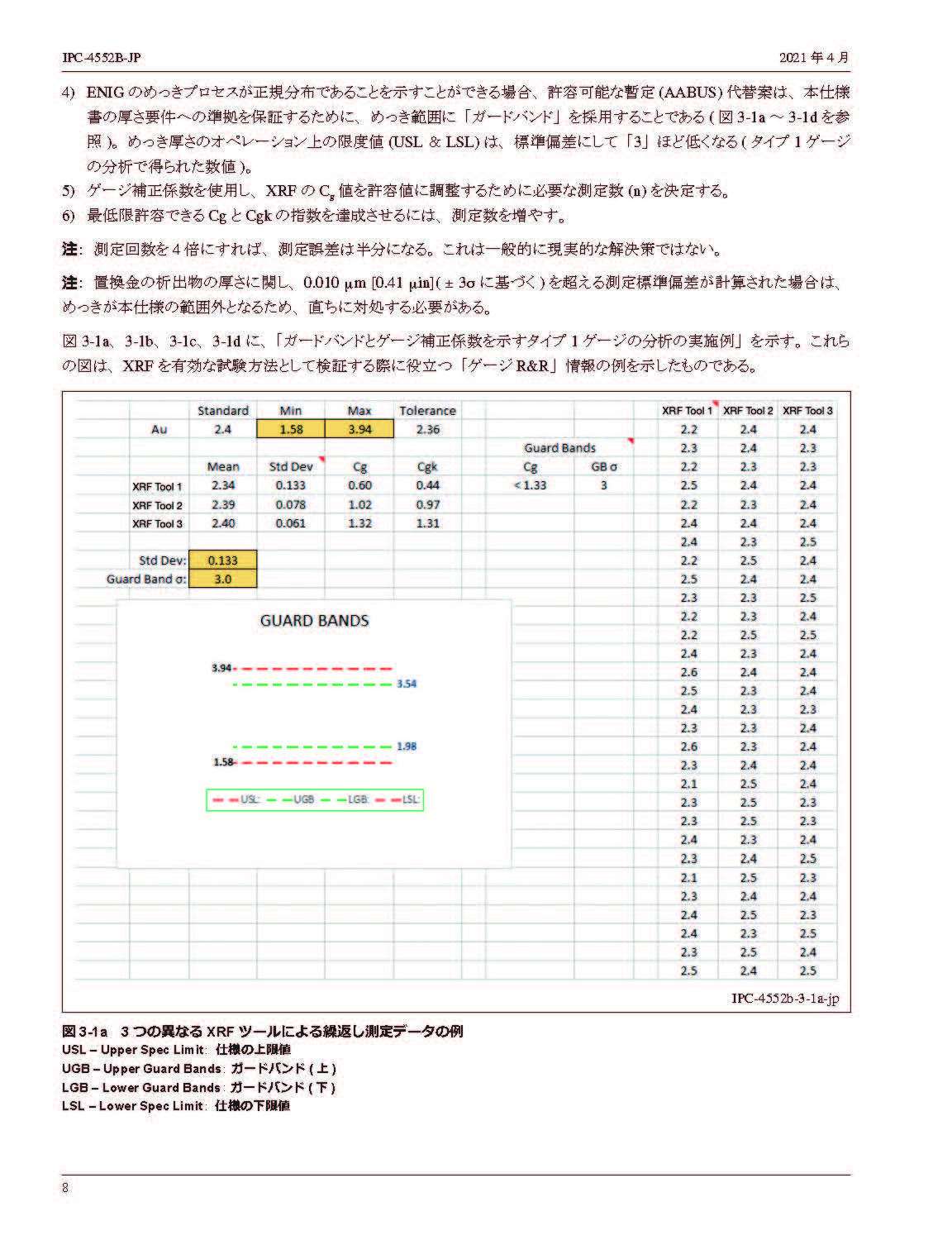 『プリント基板用無電解ニッケル/置換金(ENIG)めっきの性能仕様』IPC-4552Bは、はんだ付、ワイヤーボンディングおよび接点の仕上げ等の用途における無電解ニッケル/置換金(ENIG)めっきの析出厚さに関する要件を定めるものである。 本規格書では、IPC-6010文書群(IPC-6012、IPC-6013、IPC-6018等)に記載する性能基準に適合するための、基板の受入れ/許容基準について規定する。 本書で指定するENIGの析出物は、IPC-J-STD-003のプリント基板のはんだ付性仕様に規定される最上位のコーティング耐久性等級に適合するものである。